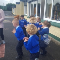We loved our first day at school. Ms. McCallion took us outside to play games. We had fun catching bubbles !